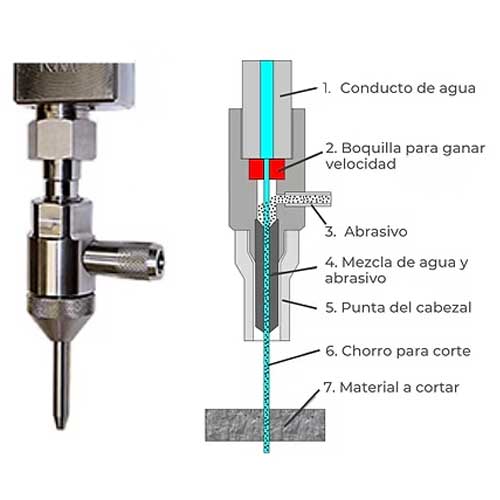 Para aumentar la potencia de corte en 1,000 veces, el granate se introduce en la corriente de chorro de agua supersónico. El agua y el granate salen del cabezal de corte a casi cuatro veces la velocidad del sonido, capaz de cortar acero de más de un pie de espesor