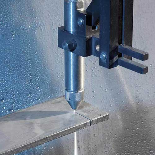 Esta presión se convierte en velocidad a través de un pequeño orificio en la boquilla, creando una corriente tan pequeña como un cabello humano que puede cortar materiales blandos.